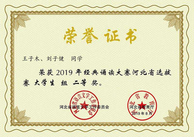 2019年6月,由河北省语委、省教育厅主办,河北大学协办的“2019年河北省经典诵读大赛”落下帷幕,我系心音朗诵社选派的两部参赛作品《雨巷》和《将进酒》,均斩获大赛二等奖。我校两组选手将与其他高校9组选手一同,代表河北省参加全国复赛。
