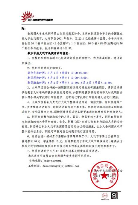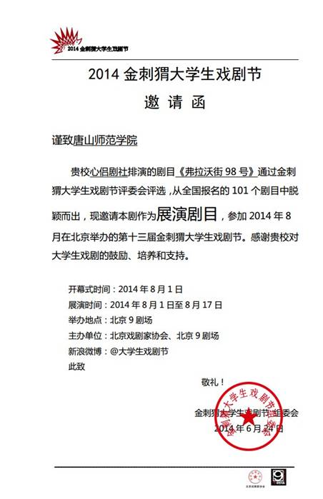 | | 2014年6月21日,2014金刺猬大学生戏剧节剧目初评会在北京9剧场举行。来自北京戏剧家协会、中央戏剧学院、北京人艺、中国艺术研究院等单位的12名评委老师,对本次大戏节报名的101部剧目进行了集中审评。唐山师范学院中文系心侣剧社的原创话剧《弗拉沃街98号》和中国传媒大学、复旦大学、上海戏剧学院、上海交通大学等名校的17部剧作脱颖而出,成功入选大戏节展演剧目。这是唐山师范学院中文系心侣剧社的戏剧继2005年、2009年两次入选全国大学生戏剧节之后第三次入选。我校作品的演出时间初步定于2014年8月2日晚19:30,8月3日下午14:30。