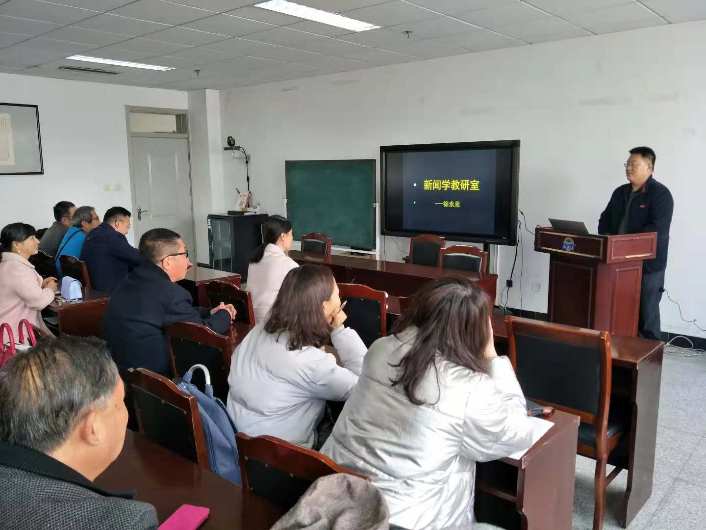 本次观摩课由新闻学教研室教师徐永泉教授主讲,题目为《“议程设置功能”理论——大众传播与环境认知》。徐老师首先提出大学课堂需要仪式感,并当场示范,老师们积极配合。随后,徐老师通过提问的方式,幽默开场,切入主题,首先梳理了近期社会上大众传播媒体热议的新闻话题,并从“议程设置功能”理论的概要及特点、对“议程设置功能”理论的相关研究、研究“议程设置功能”理论的意义三个层面阐释了“议程设置功能”的内涵与影响,有理有据,娓娓道来,各位老师听得津津有味,并与徐老师频繁互动,课堂氛围十分活跃。