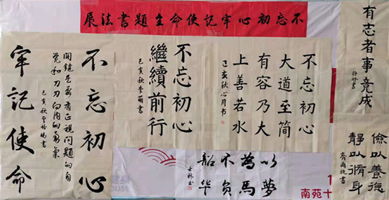 为配合正在举行的“不忘初心、牢记使命”主题教育活动,中文系主办、心画书法社承办的主题书法展览在北院举行,展览以“不忘初心、牢记使命”为主题,用楷书、行书、隶书等多种书体书写了有关内容,表达了青年学子衷心拥护党的领导的,以为人民谋幸福为己任的远大理想。