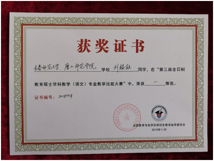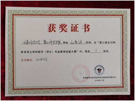 2018年11月17日至19日,由全国教育专业学位研究生教育指导委员会主办的第三届全日制教育硕士学科教学(语文)专业教学技能大赛在江西师范大学举行。来自全国的88所院校的315名学科教学(语文)研究生参加复赛,经专家评审选出120名选手参加决赛。我校与长春师范大学联合培养的两名研究生均进入决赛。其中刘铭钰荣获决赛一等奖,刘彦廷荣获决赛三等奖,学科教学(语文)导师团队李海凤老师被评为优秀指导教师。我校被全国教育专业学位研究生教育指导委员会授予第三届全日制教育硕士学科教学(语文)专业教学技能大赛组织奖。