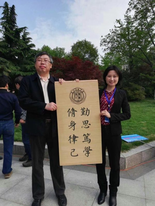 开幕式上,我校代表队领队、秘书学教研室主任陈伟莲老师向承办此次活动的江苏师范大学副校长钱进教授赠送了礼物——由中文系党总支书记、书法教育研究所所长张学鹏教授书写的内容为我校校训并印有我校校徽的笔帘。