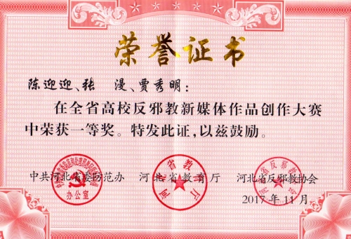 由中共河北省委防范和处理邪教问题领导小组办公室、河北省教育厅、河北省反邪教协会组织的全省高校反邪教新媒体作品创作大赛近日评选结束,我校中文系赵立杉老师指导,学生陈迎迎、张漫、贾秀明创作的作品荣获一等奖,另有五件作品荣获二等奖、优秀奖,为我校赢得了荣誉。